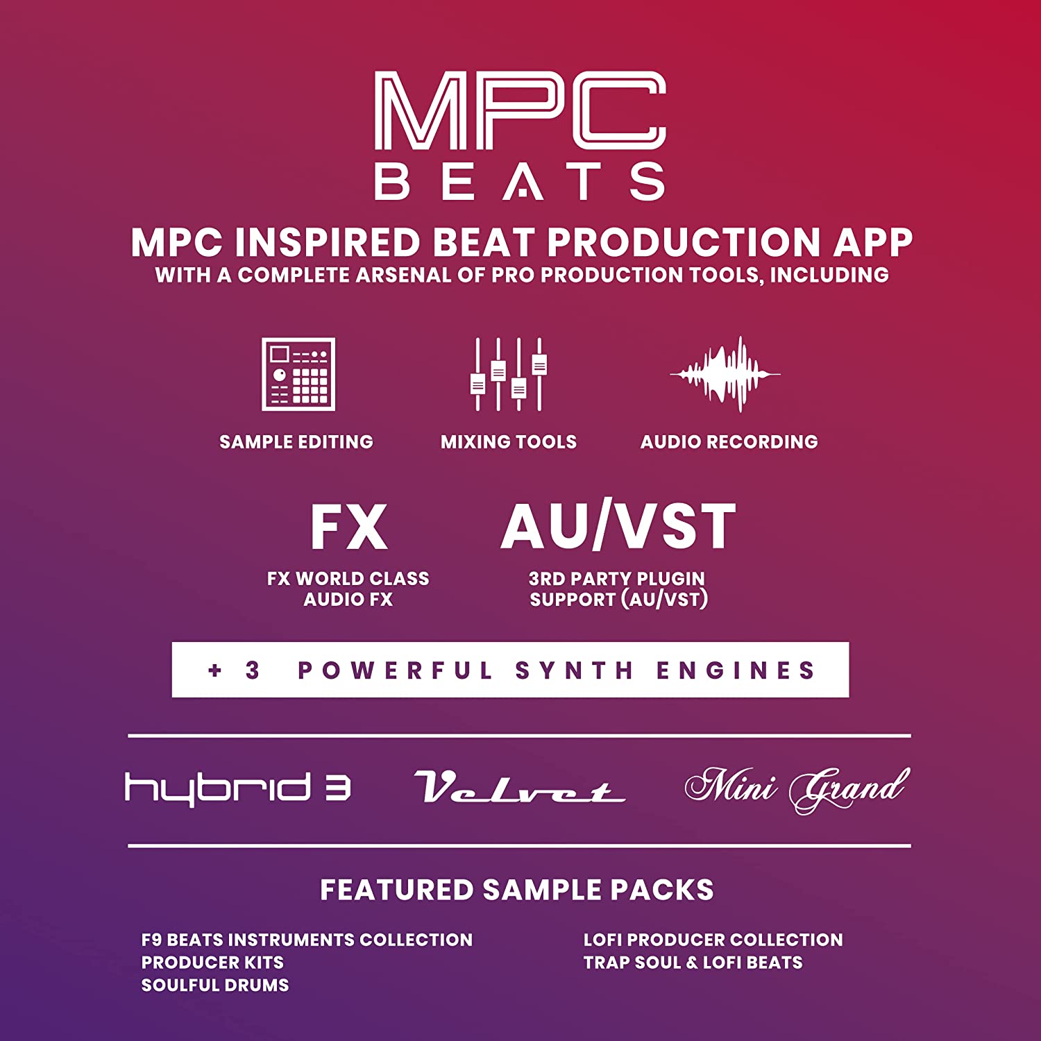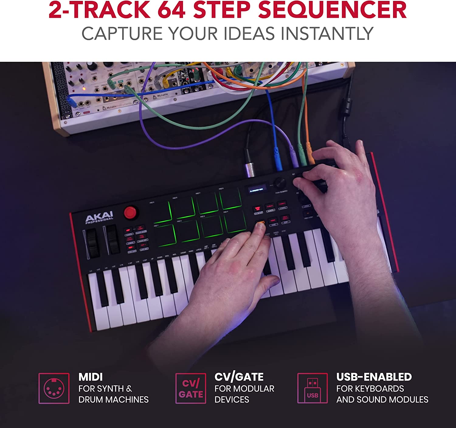 The new 2-track step sequencer is convenient when you need to capture new ideas on the fly. Connect to Class -Compliant USB devices or 5-pin MIDI devices. MPK Mini Plus also features CV/Gate connectors to interface with your racks and other modular synths. Record up to 8 notes per chord step and up to 16 note drum step patterns. Includes MPC Beats The bundled MPC Beats software DAW for Mac and PC offers the iconic MPC workflow right on a desktop or laptop computer, and also includes thousands of sounds, drum samples, loops, and plugin instruments to create your next hit song.