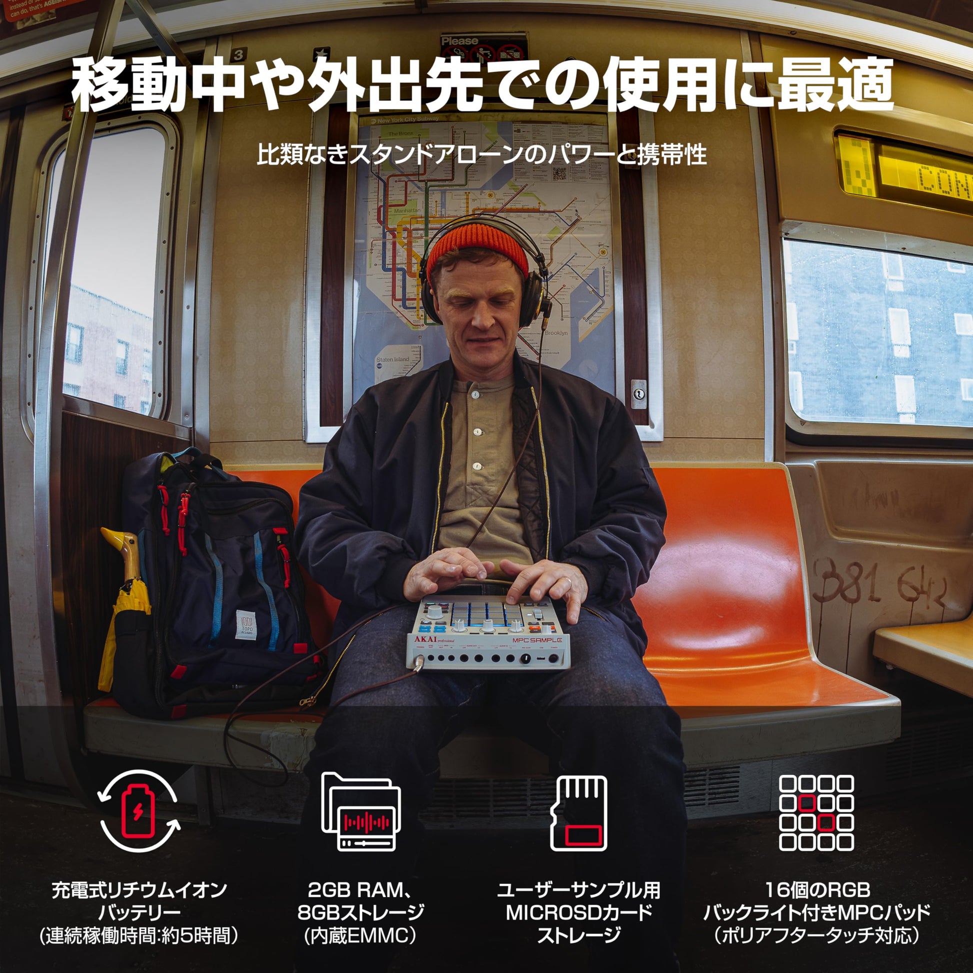 The Akai Pro MPC Sample is a portable, standalone music production powerhouse, featuring 16 RGB-lit velocity-sensitive pads, full-color LCD waveform editing, fast sample-to-pad workflow, and onboard effects for complete beat-making on the go. Its rechargeable battery, built-in mic, and microSD expansion make it ideal for mobile recording and performance.