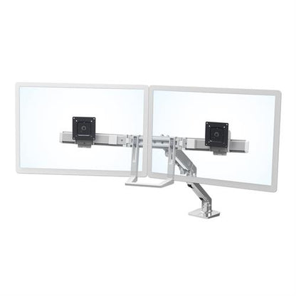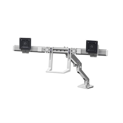 Includes arm, extension, hinge bow, two monitor pivots, handle, desk clamp, grommet mount, mounting hardware.