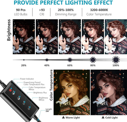 Dimmable USB-Powered LED Ring Light: Color temperature 3200k-6000k; 3 light modes (white, warm white, warm yellow) and dimmable brightness (20% increasement) can meet all your needs; Easy control on usb cord to power on/off or switch to the lighting mode you prefer; No battery needed, works with most devices that support USB port.