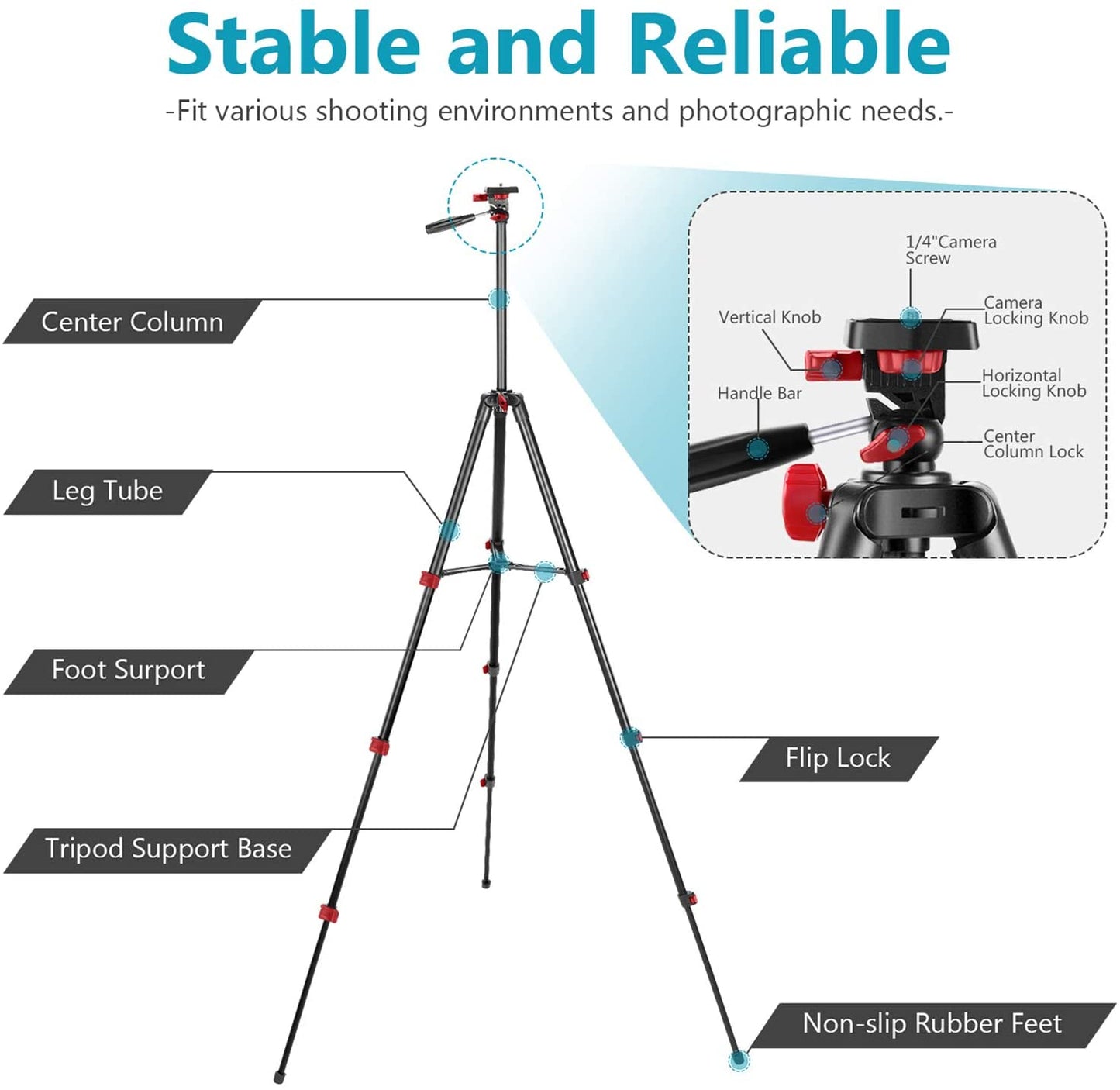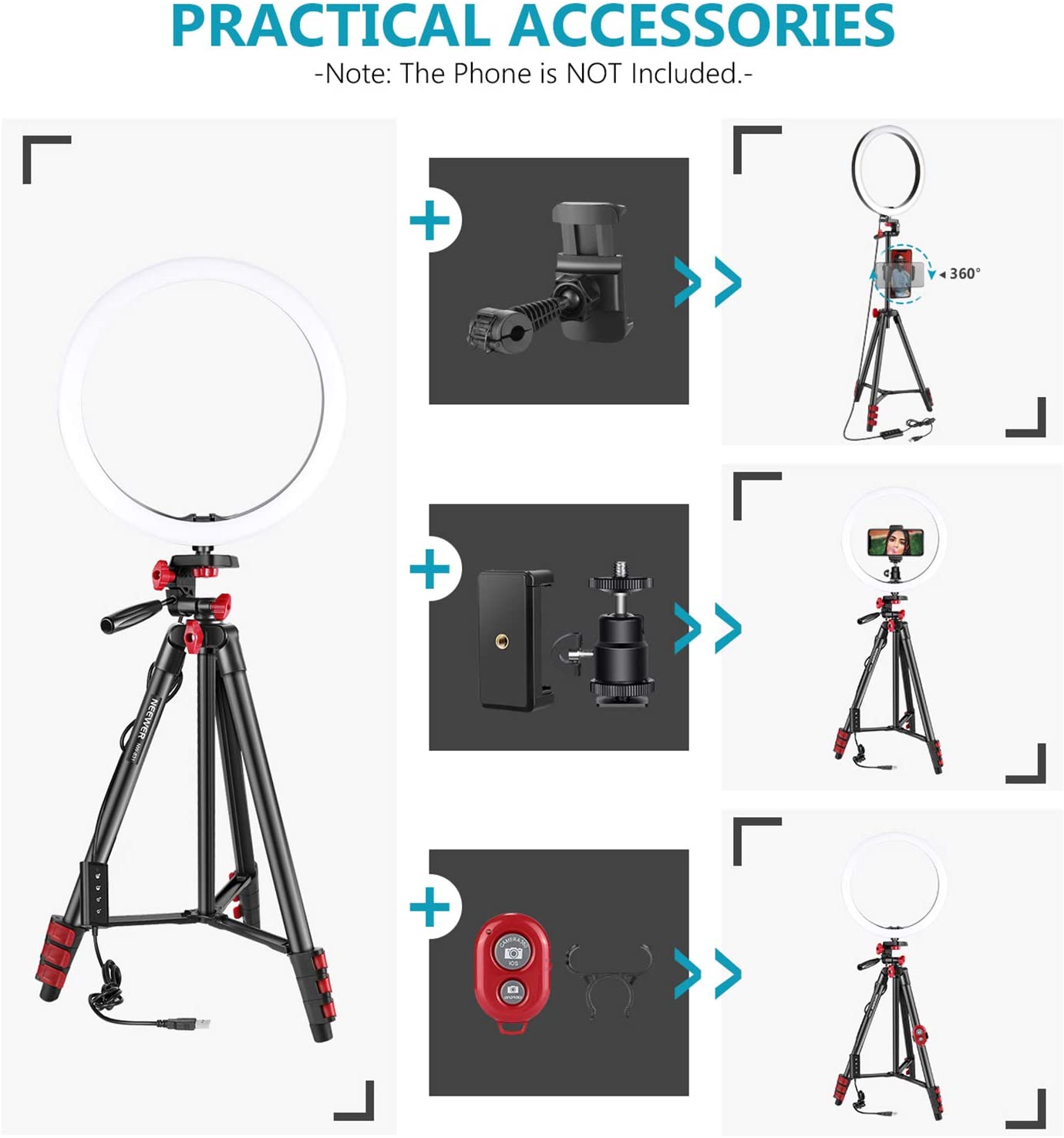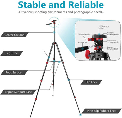Lightweight and Stable Tripod: 4 section adjustable aluminum alloy legs with quick pull flip type locks allows you to adjust the working height from 15.7 inches to 54 inches in seconds and folded into 16.5 inches. 3-way pan head with a convenient handle allows for tilt and swivel motion, making it easy to target the ring light to your subject at any angle; It is stable enough to support the heaviest smartphones or small cameras up to 4.4 pounds.