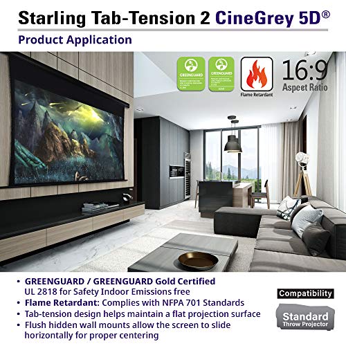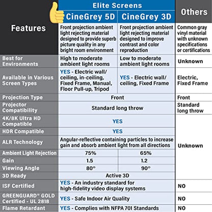 • 【無與倫比的最先進螢幕材質】螢幕材質:CineGrey 5D,1.5 增益。角反射、環境光抑制技術螢幕,具有 88% 的偏振保留率和 80 度視角。 4K 超高清和主動/被動 3D 就緒。非常適合對入射光控制較少的房間,並將投影機亮度提高 1.5 倍,使其成為低流明投影機的出色螢幕。 GREENGUARD 和 GREENGUARD GOLD UL 2818 安全認證 無室內排放