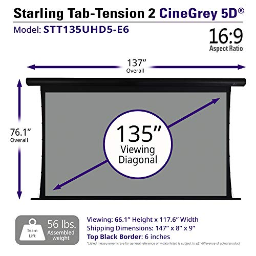 • 【135 吋優質投影機螢幕】135 吋對角線,66.2 吋高 x 117.7 吋寬觀賞尺寸,16:9 高清格式長寬比,帶有黑色天鵝絨飾面框架。整體組裝尺寸:80.6 英吋高 x 138.2 英吋寬 x 5.5 英吋深。黑盒。